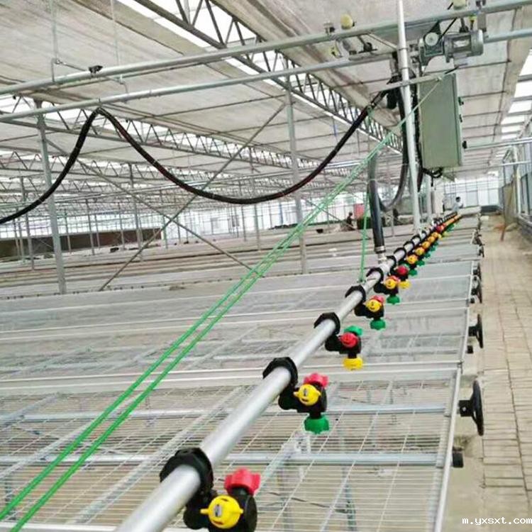 喷灌机,利用微电脑和磁性号进行控制,并加以遥控装置,自动化程度很高,悬挂在温室上部的双 轨道管上,能够根据用户的选择实现:正向运行、反向运行、连续喷灌,及相应的正向喷淋、反向喷淋以及往返喷淋。喷灌机为双臂喷灌管,每个喷头有三种不同流量和雾化程度的喷嘴,轻轻转动该喷头就可选择合适的喷嘴。